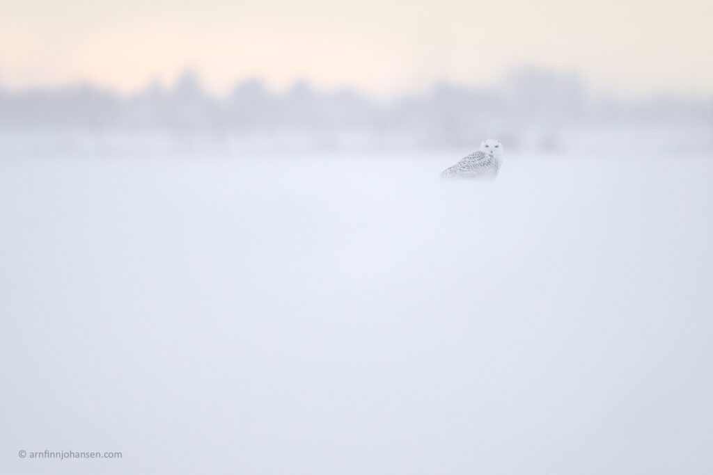 Landskapet kring Ottawa är ett öppet, ljust jordbrukslandskap där fält och öppna marker vintertid täcks av ett tjockt lager snö som reflekterar ljuset även under molniga dagar. För en fjälluggla, som jagar med synen, är detta en idealisk jaktmark där små rörelser från sorkar och andra smådjur avslöjas mot den vita bakgrunden. Spridda dungar av lövskog, frusna våtmarker och låga buskage bryter av det öppna landskapet. Här finns sittplatser där ugglan kan vila, spana och spara energi mellan jakterna. Från en stolpe, en höbal eller en låg trädgren kan den överblicka stora områden utan att själv synas särskilt tydligt i det vinterbleka ljuset. Mitt på dagen kan de också sitta helt stilla mitt ute på tundran. Vinden sveper ofta fritt över fälten och formar snön till mjuka drivor och vågiga formationer. För fjällugglan är vinden både en utmaning och en fördel – den kan bära ljud och dofter, men hjälper också ugglan att glida nästan ljudlöst över landskapet när den jagar. Ljuset under den kanadensiska vintern är lågt och mjukt under stora delar av dagen. Solen står lågt över horisonten och skapar långa skuggor och ett varmt, gyllene ljus mot snön.